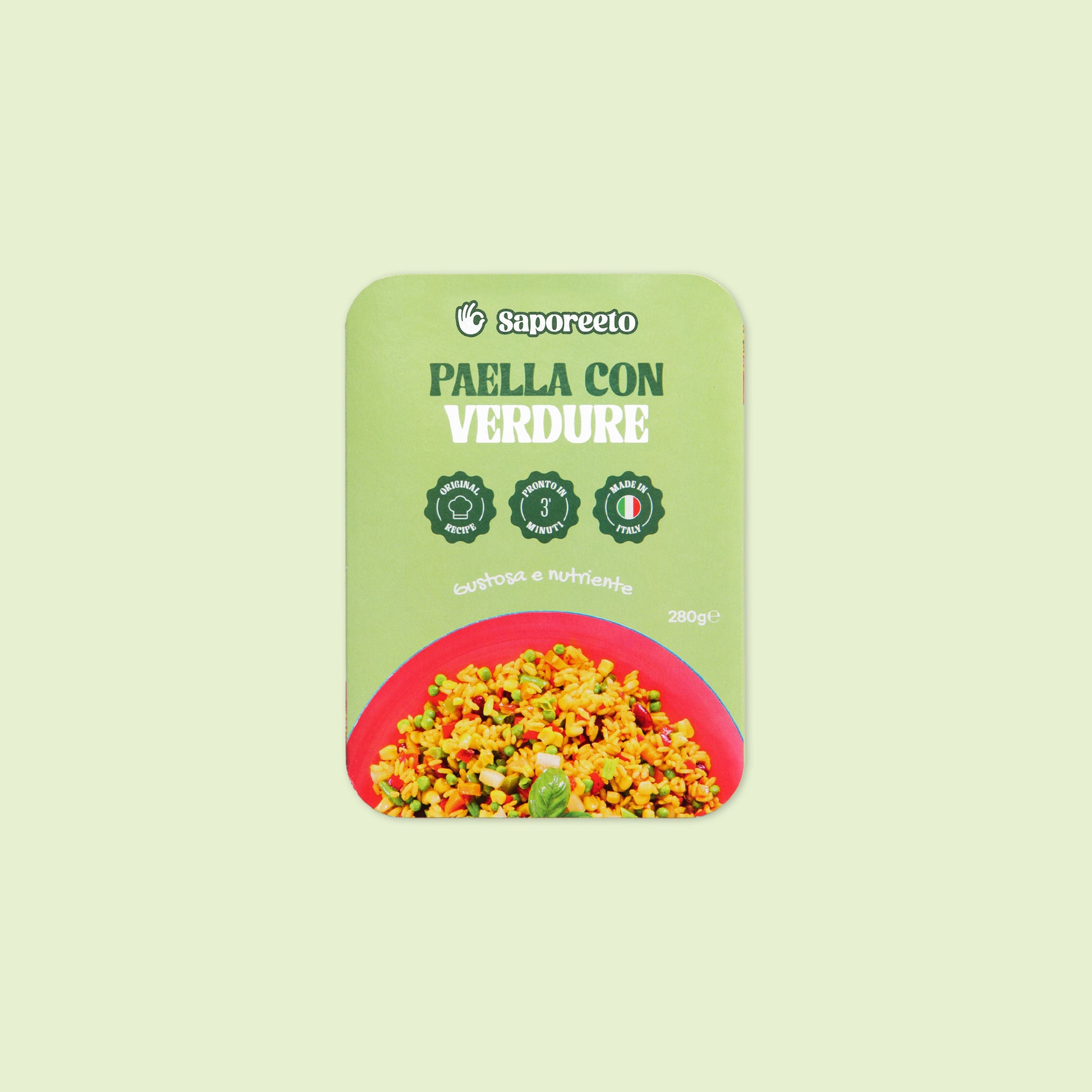 INGREDIENTS: mixed vegetables (sweet corn grains, rehydrated dried red beans, carrots, CELERIAC, green beans, peas, red peppers, green peppers) 45%, water, Carnaroli rice 25%, olive oil, salt, sweet paprika , bay leaf, black pepper, smoke flavouring, saffron.